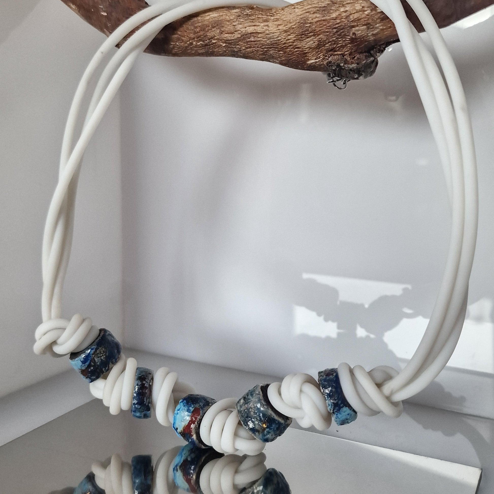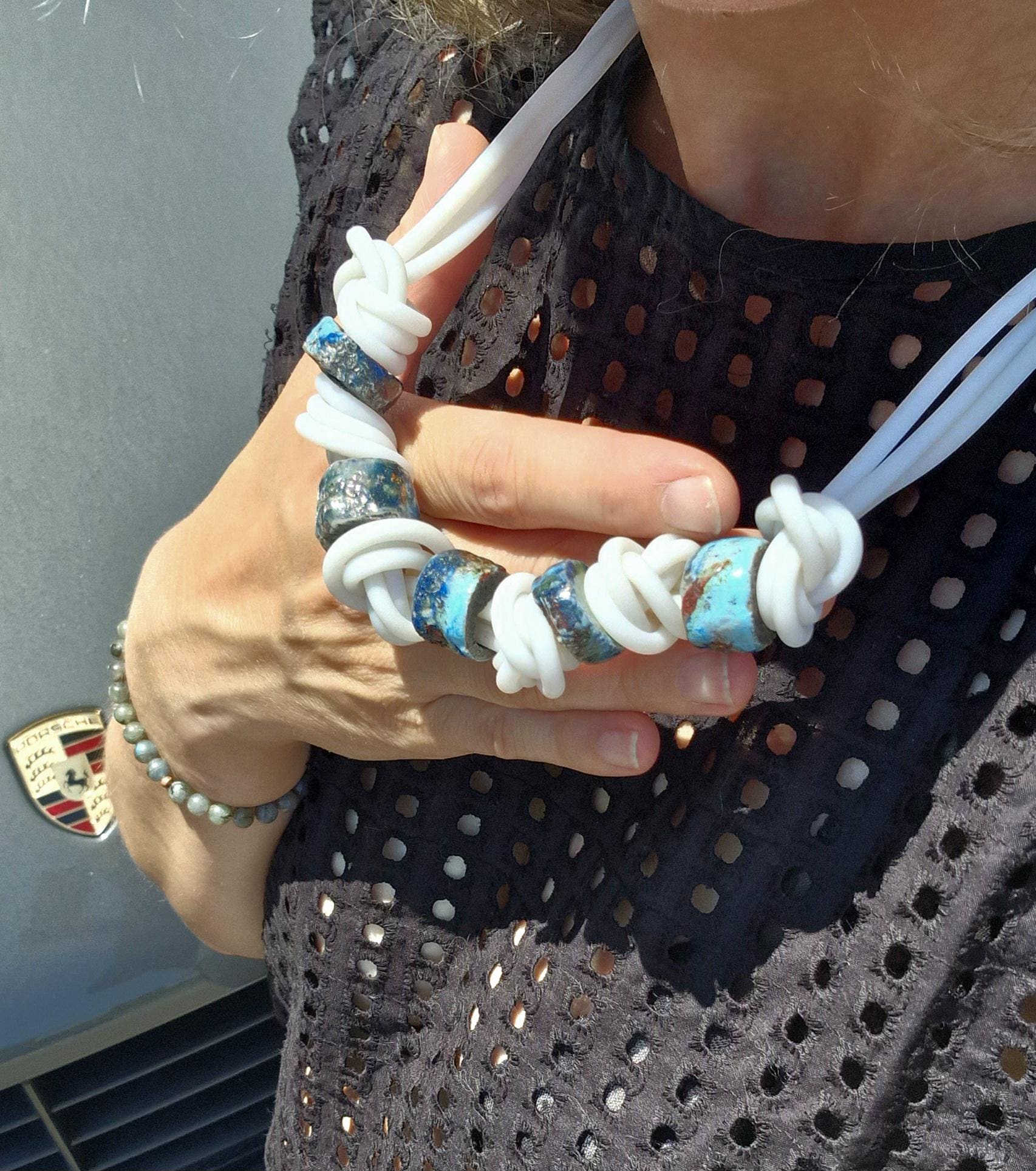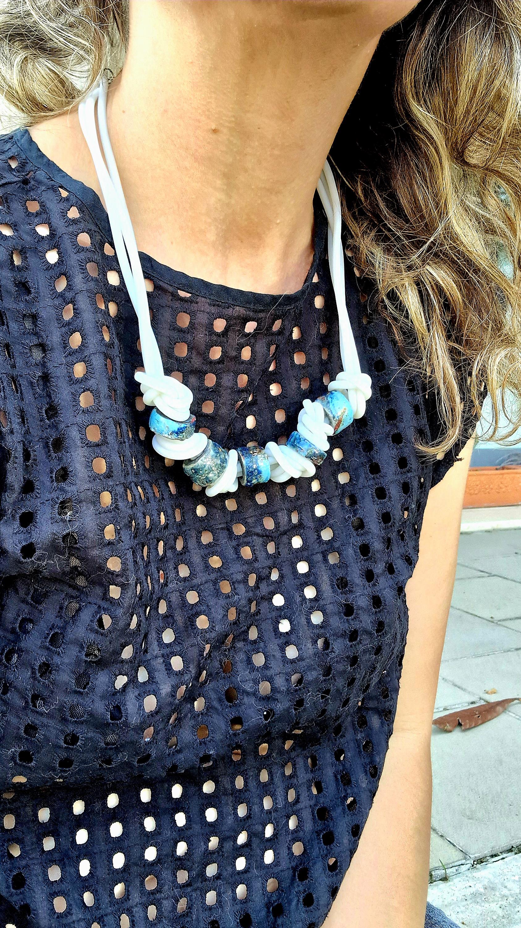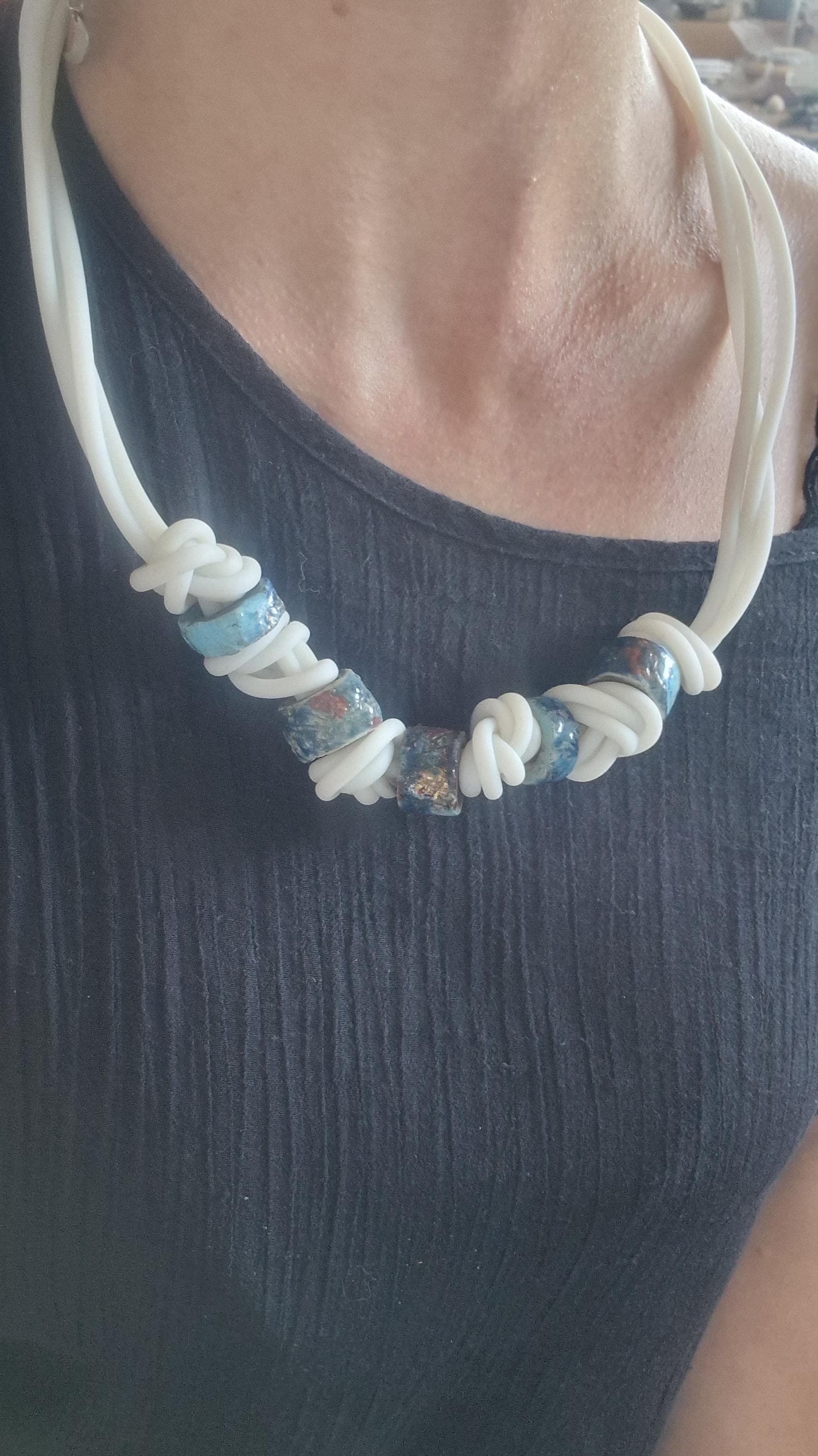 collana moderna fatta a mano, gioiello minimalista, elegante collana bianca e turchese, design semplice unico e artigianale, arte indossata