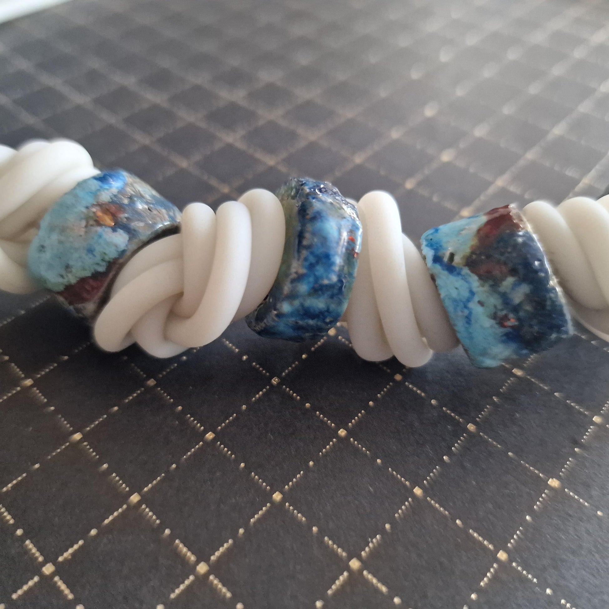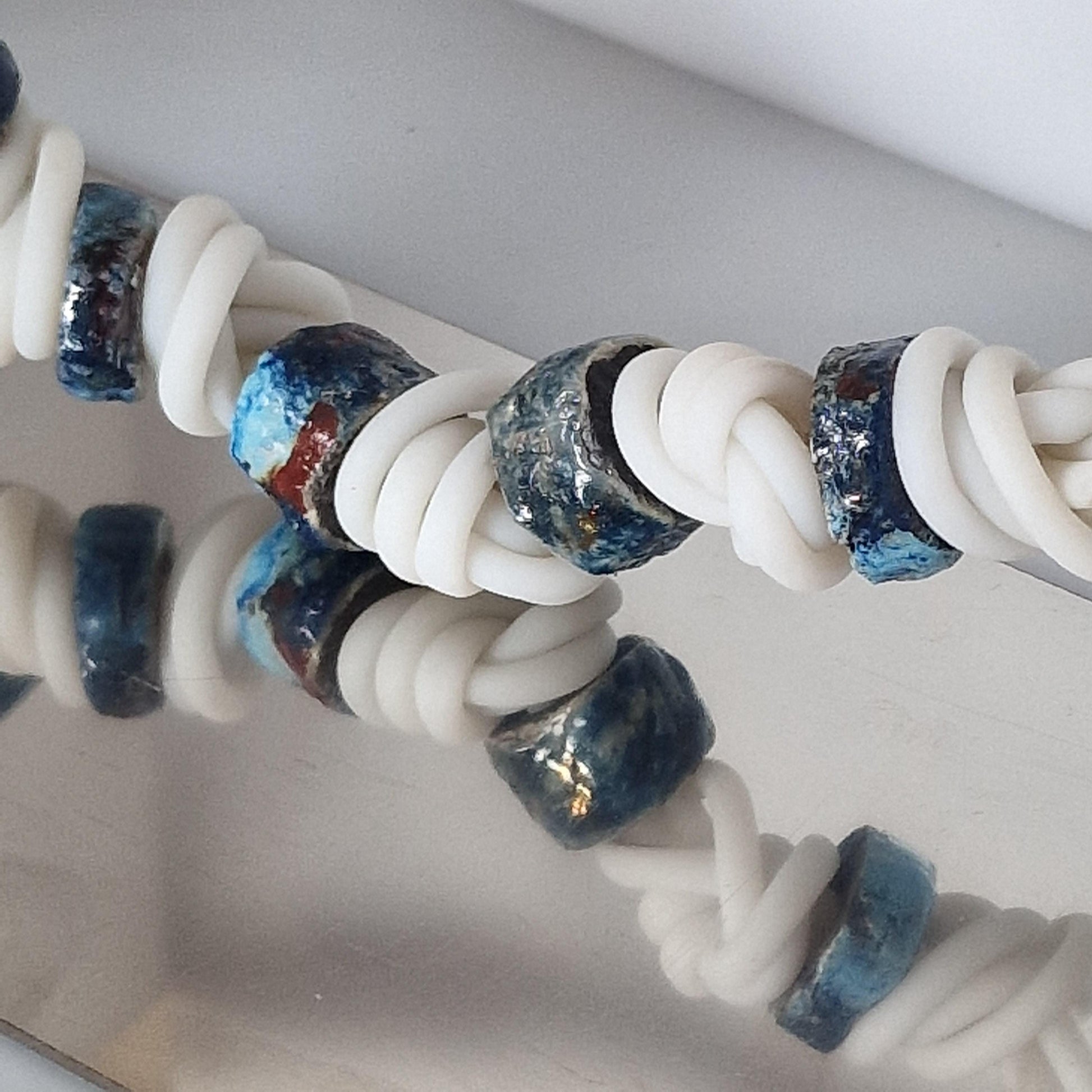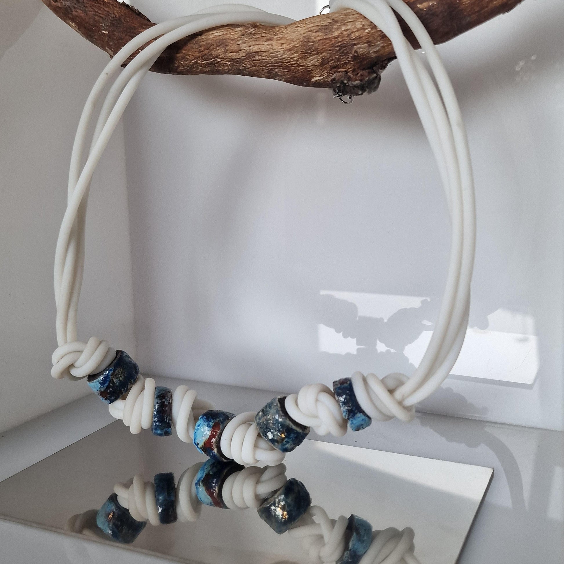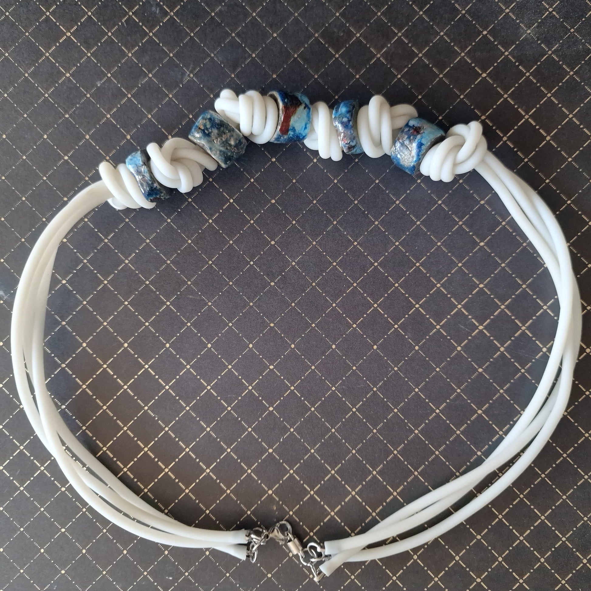 collana moderna fatta a mano, gioiello minimalista, elegante collana bianca e turchese, design semplice unico e artigianale, arte indossata
